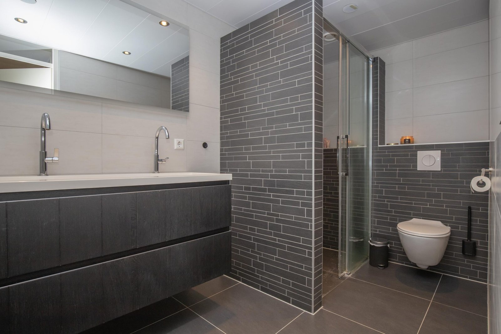 De ruime overloop – eveneens met visgraat PVC – biedt toegang tot twee royale slaapkamers van 11 en 13 m². Hier vindt u ook een handige bergruimte met witgoedaansluitingen. De moderne badkamer is compleet betegeld en uitgerust met een luxe inloopdouche met rainshower, dubbele wastafel, en een zwevend toilet.