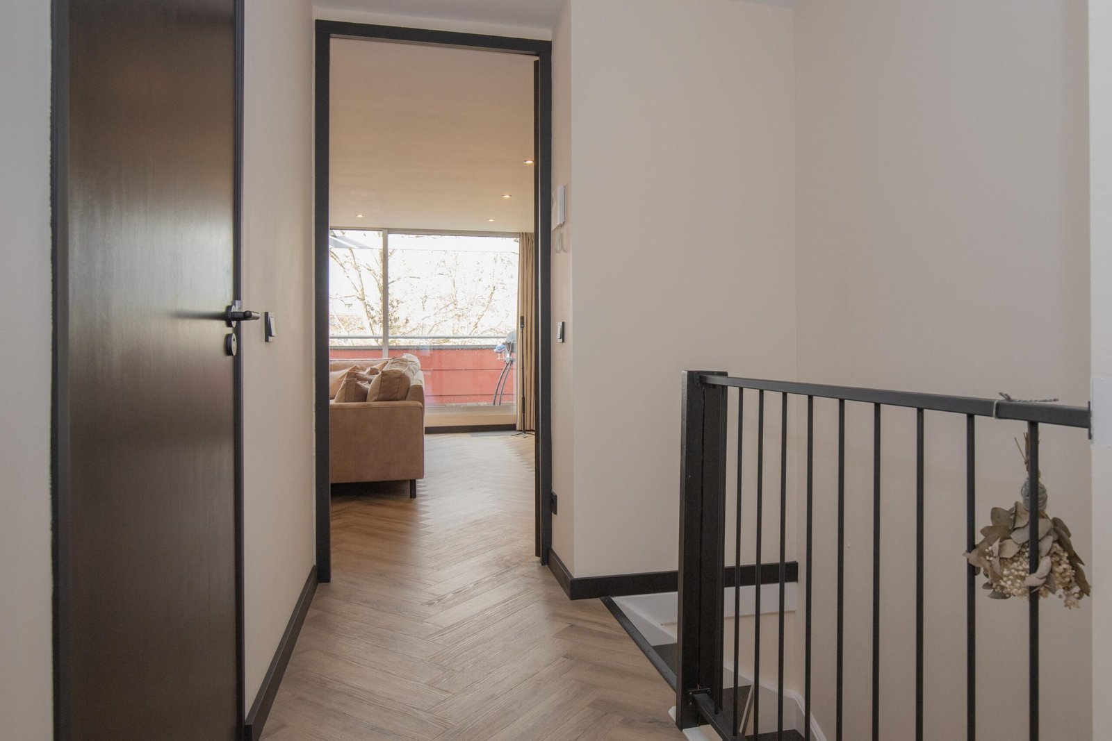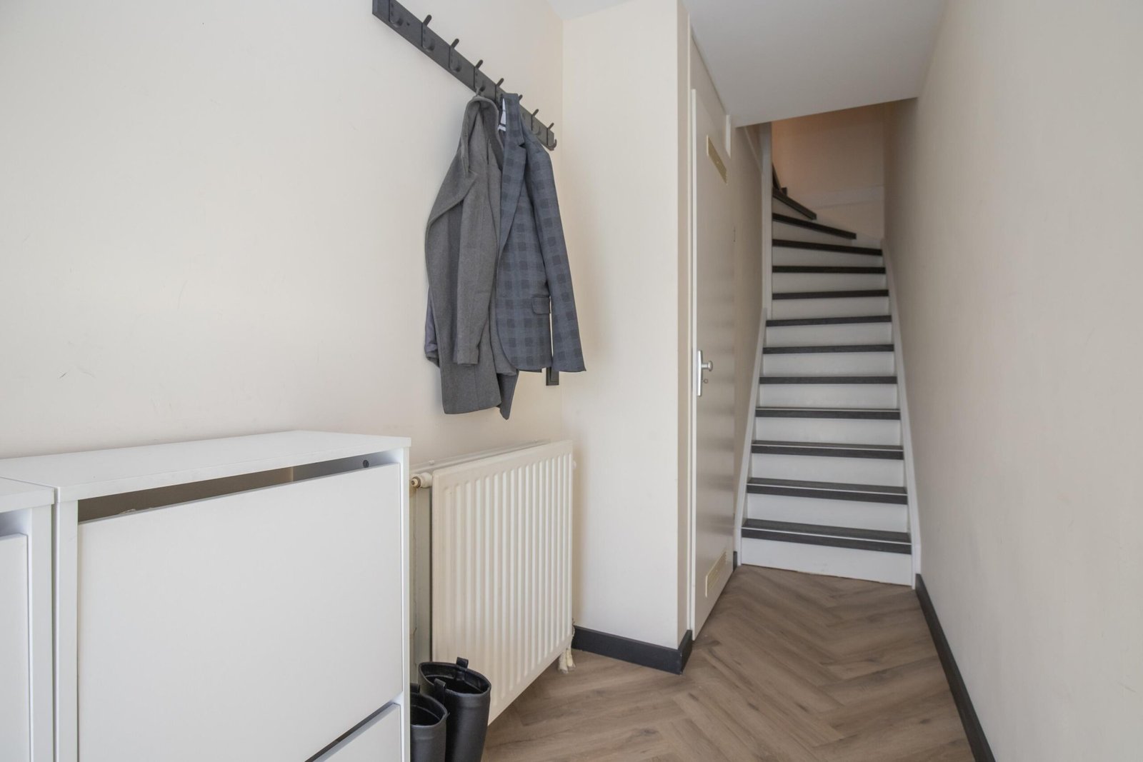 Via de verzorgde entreehal met garderobe en meterkast bereikt u de trap naar boven. De woning is in 2022 volledig vernieuwd met een stijlvolle visgraat PVC-vloer, die zelfs op de trap is doorgelegd.