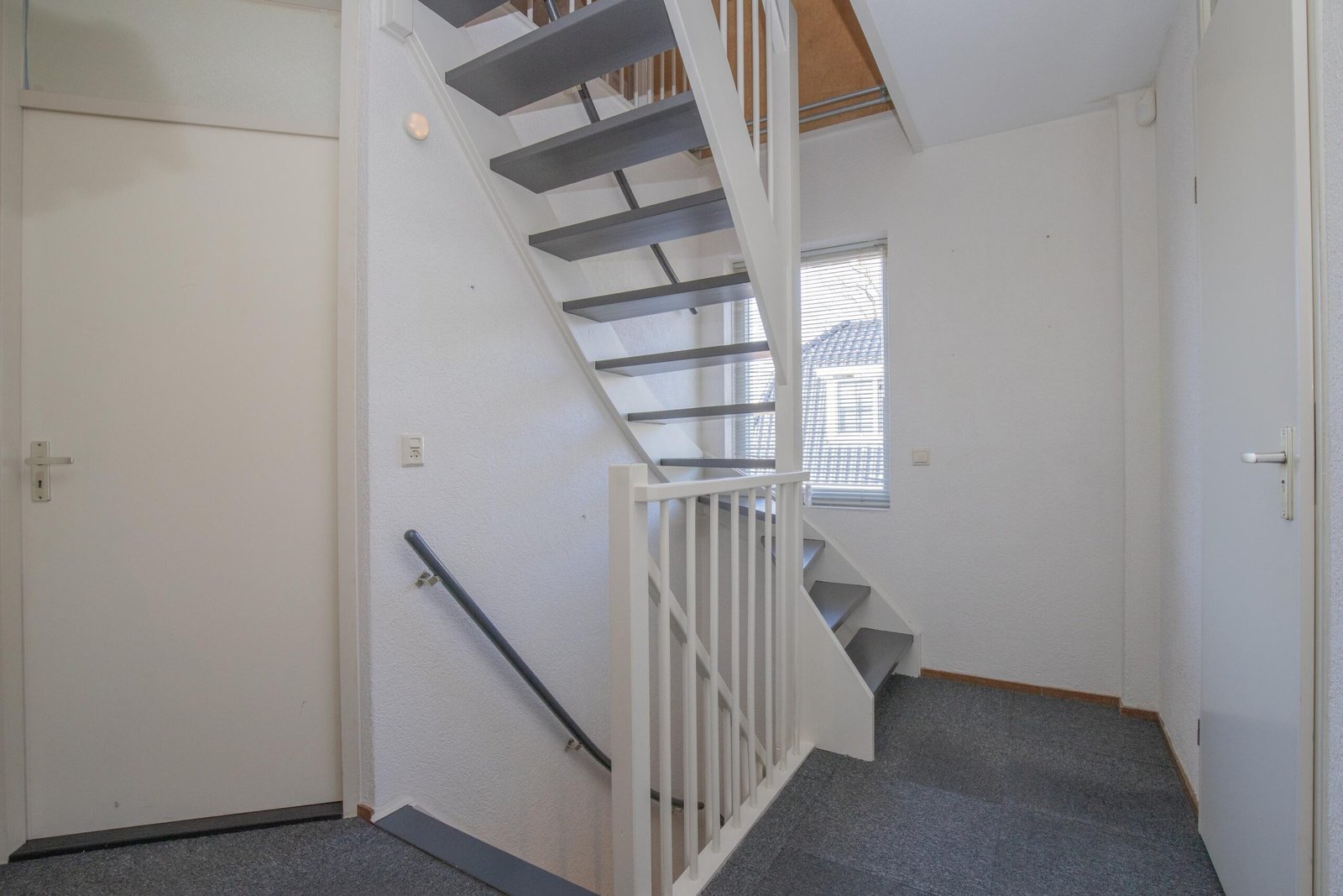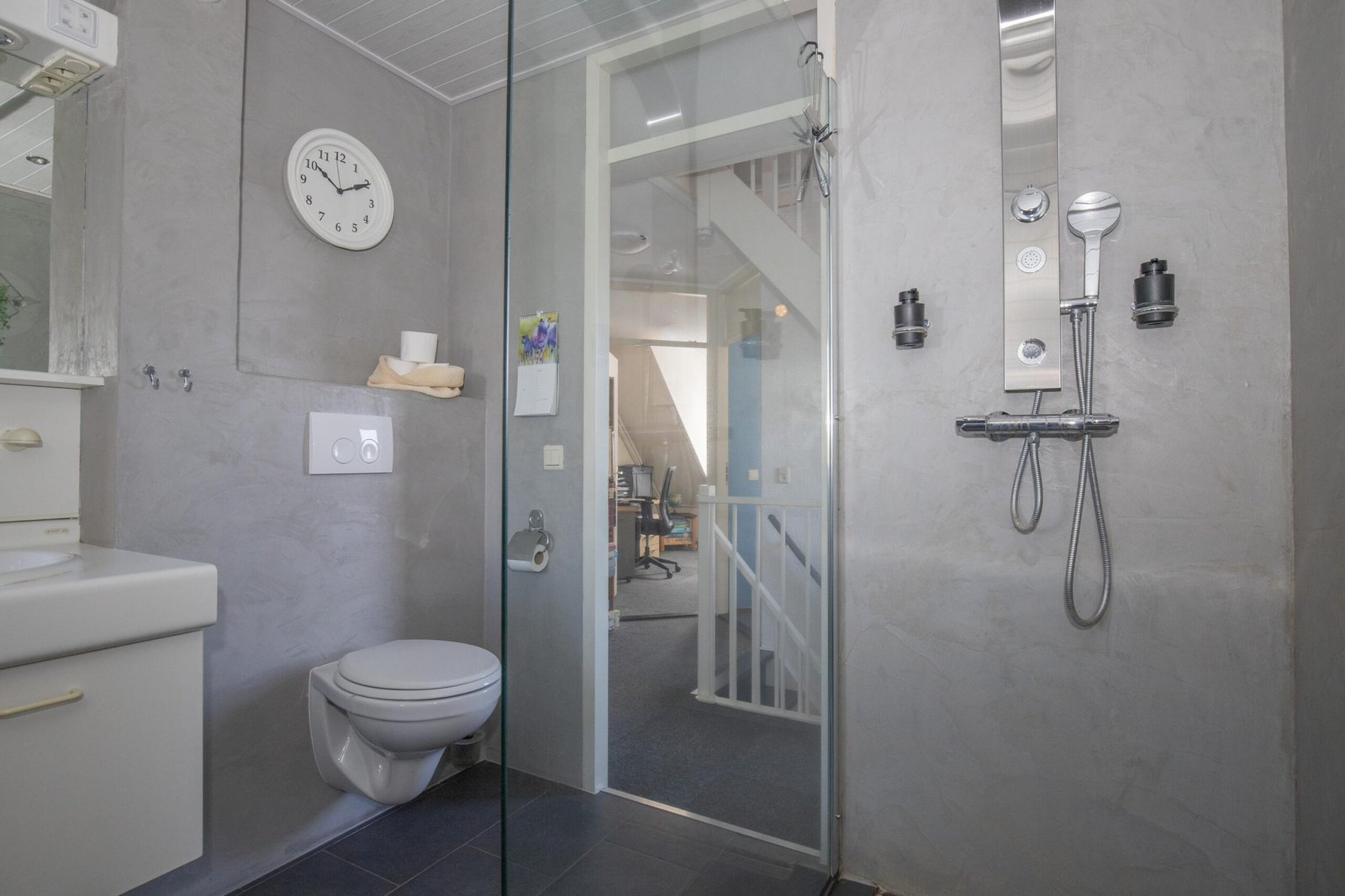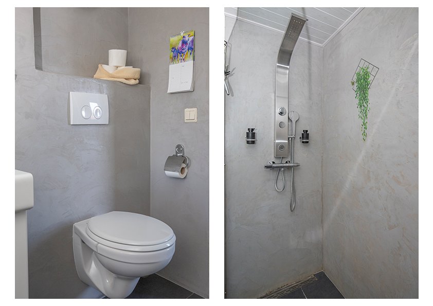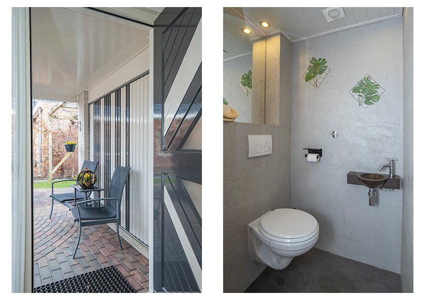 De woning verwelkomt je met een verzorgde hal met een parketvloer, wit granol op wanden en trap naar de eerste verdieping. De moderne toiletruimte is voorzien van een hangend toilet en de wanden en vloer zijn afgewerkt met beton-ciré en een fonteintje van zwart hardsteen maken het compleet.