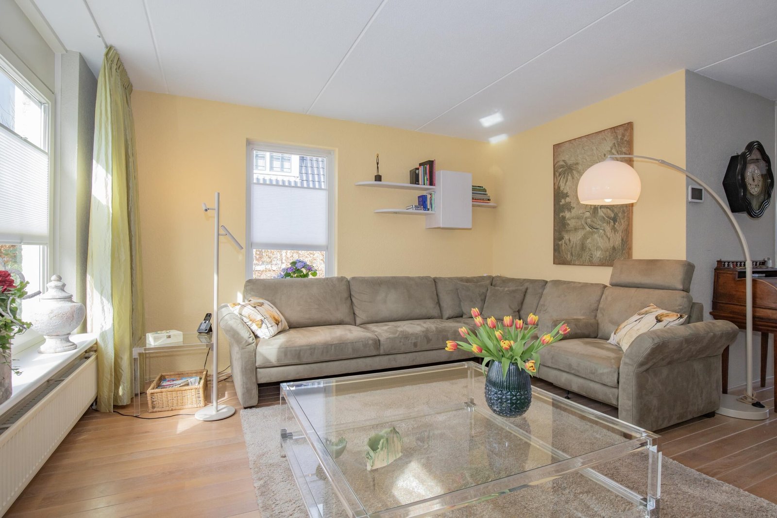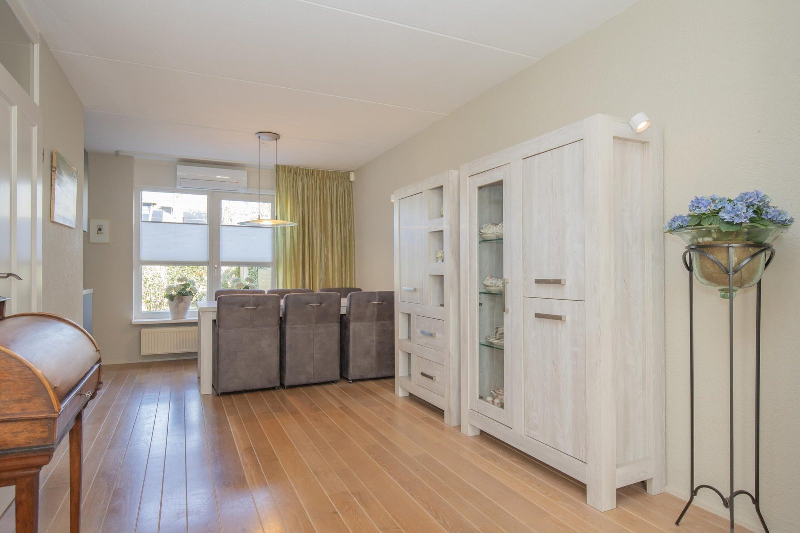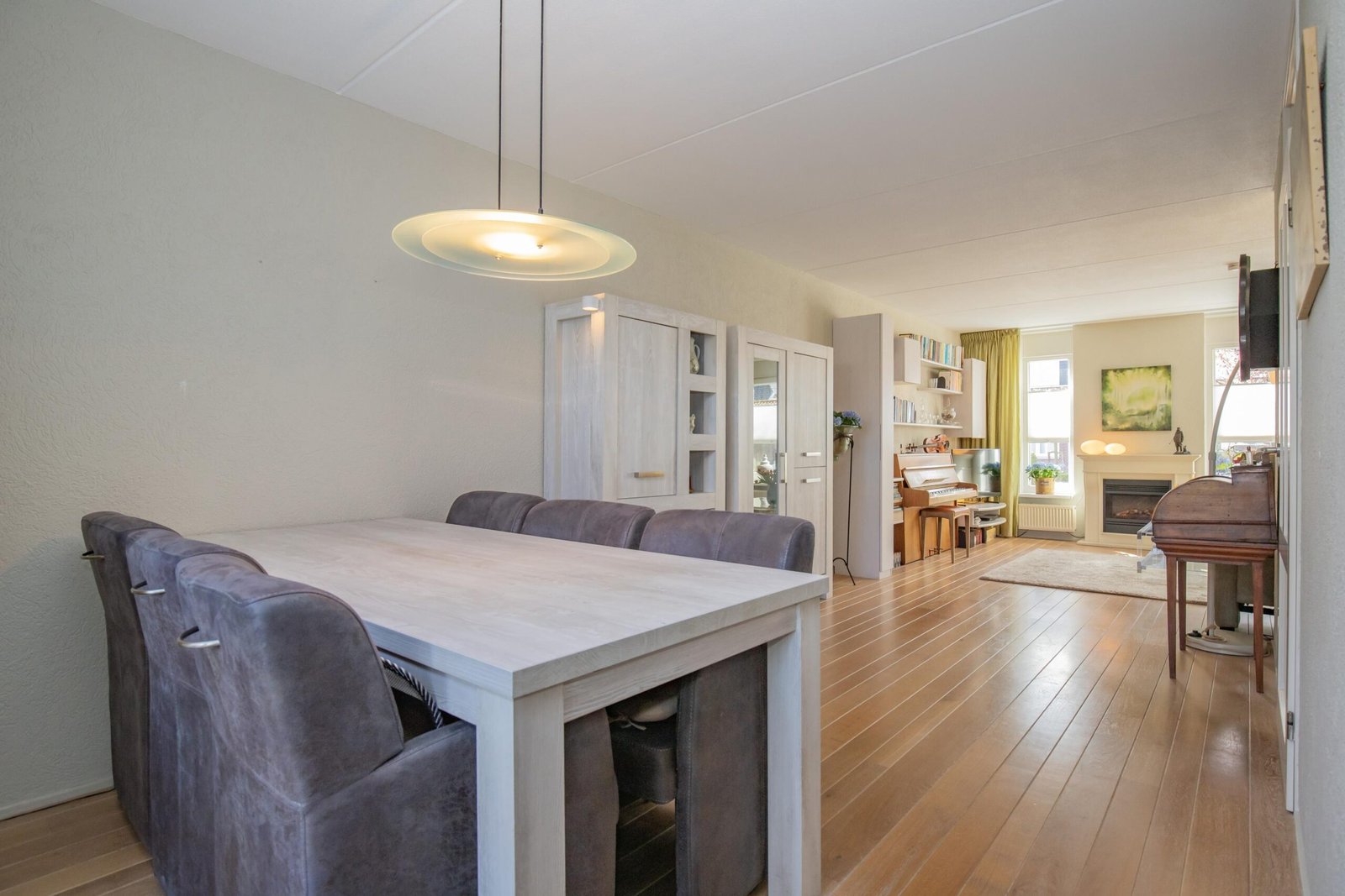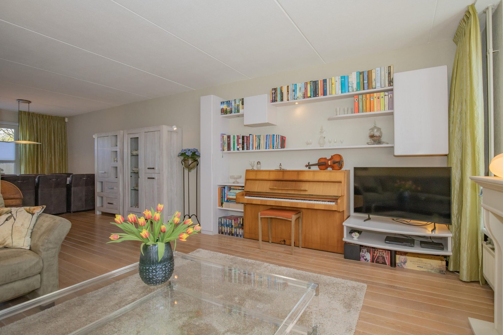 De woonkamer is heerlijk licht dankzij de grote raampartijen en biedt een warme, huiselijke sfeer. Aan één wand zijn diverse kastdelen geïntegreerd met boekenplanken, twee opbergkasten, een Tv meubel en een zogenaamde apothekerskast in een witte kleurstelling. In dit wandmeubel is ruimte gecreëerd voor een piano (die eventueel ook achter kan blijven). Een andere wand heeft twee boekenplanken en een opbergkast in hetzelfde design. Met een airco voor zowel koelen als verwarmen en twee zonneschermen is deze woonkamer een plek waar je zó kunt intrekken.
