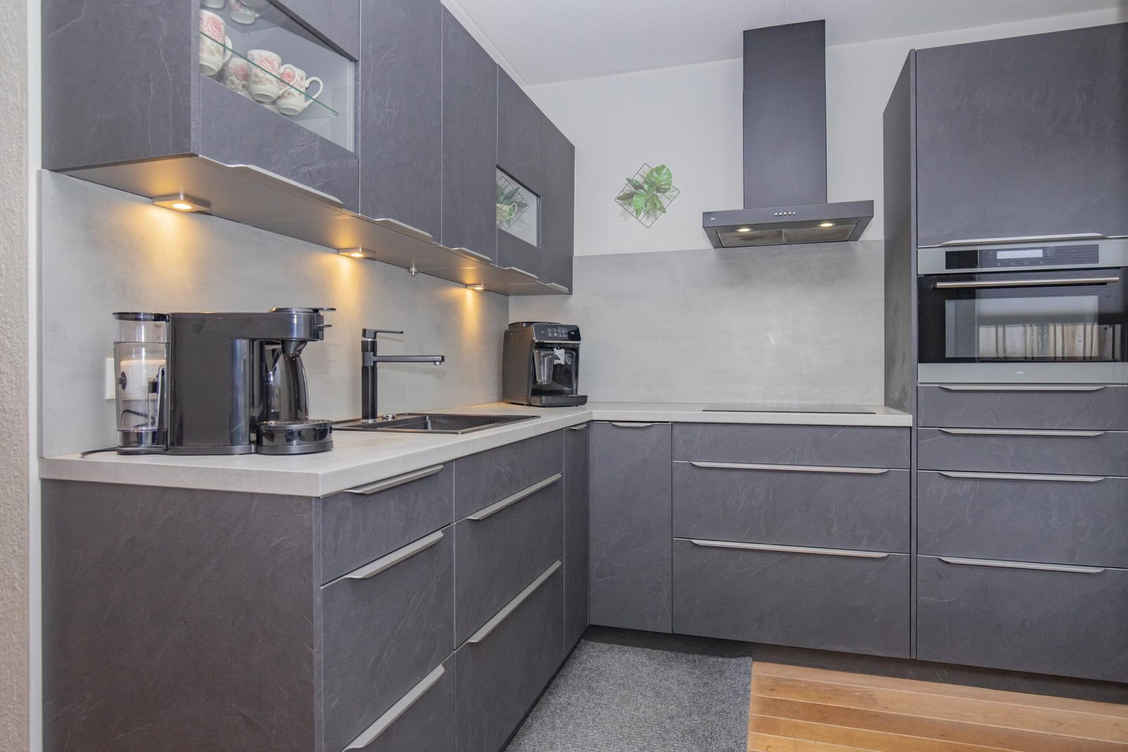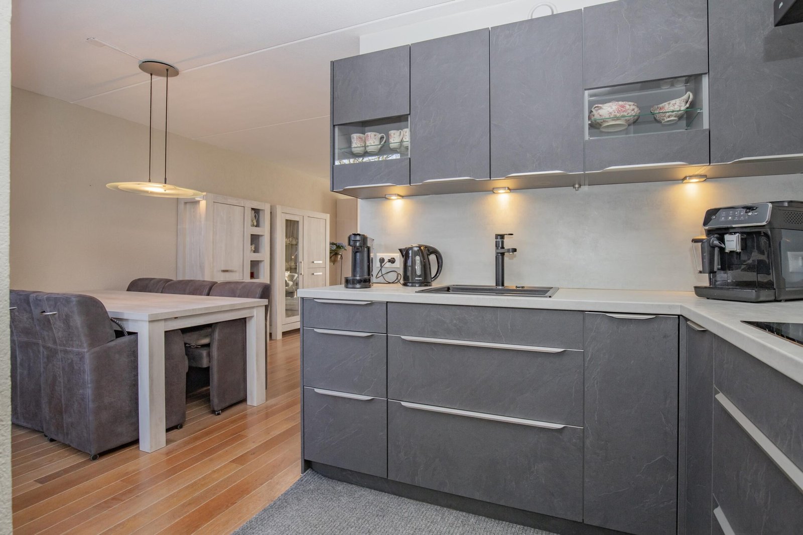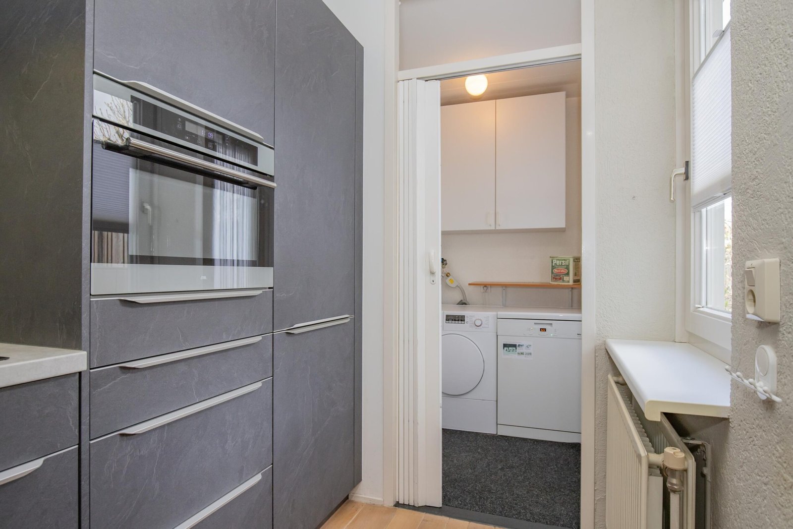 De keuken - die zes jaar geleden is geplaatst - is antraciet van kleur en is zeer praktisch ingericht en voorzien van alle gemakken zoals een oven/magnetron, koel-vriescombinatie en inductiekookplaat met afzuigkap. Aansluitend vind je de bijkeuken met de vaatwasmachine, witgoedaansluitingen en toegang tot de garage welke is voorzien van elektra en aansluiting voor verwarming.
