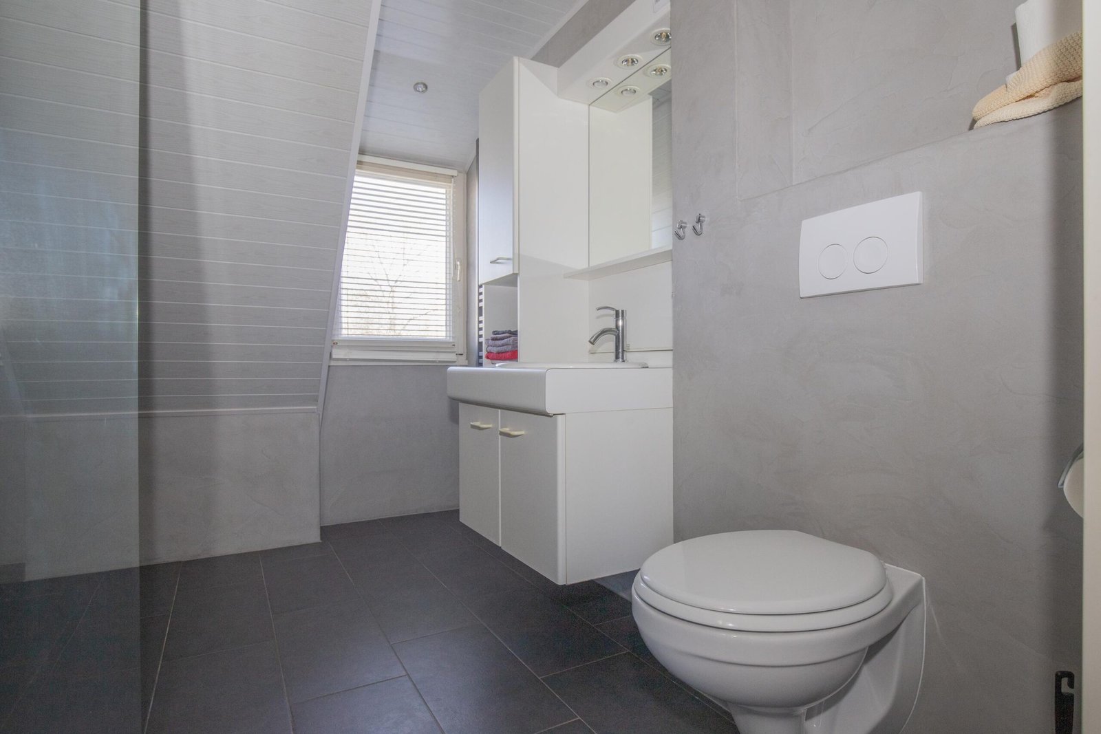 Op de eerste verdieping vind je drie slaapkamers en een complete, moderne badkamer met inloopdouche (inclusief massagefunctie!), wandcloset, wastafelmeubel en designradiator – strak afgewerkt met beton-ciré en antraciet kleurige tegels. De master bedroom beschikt zelfs over een eigen wastafel.